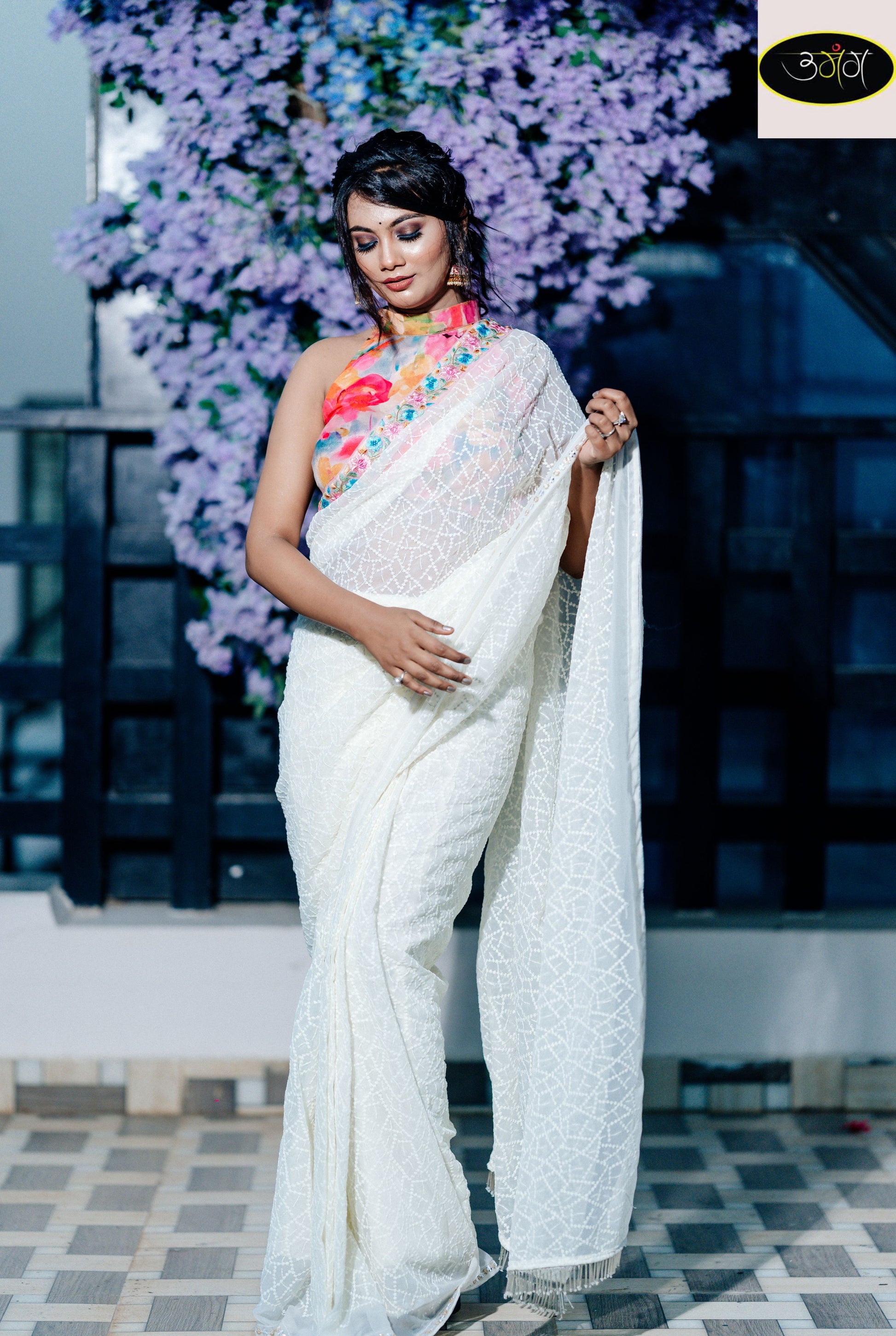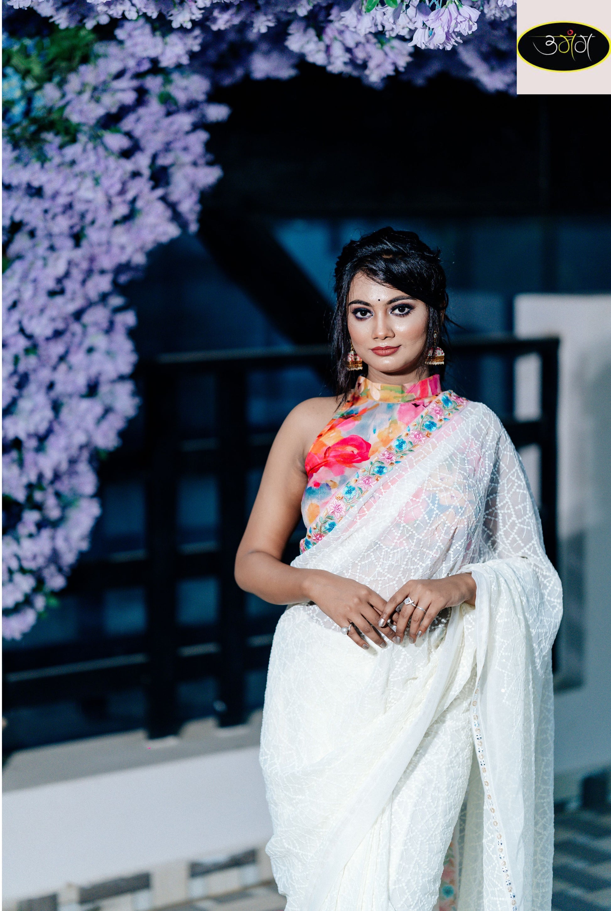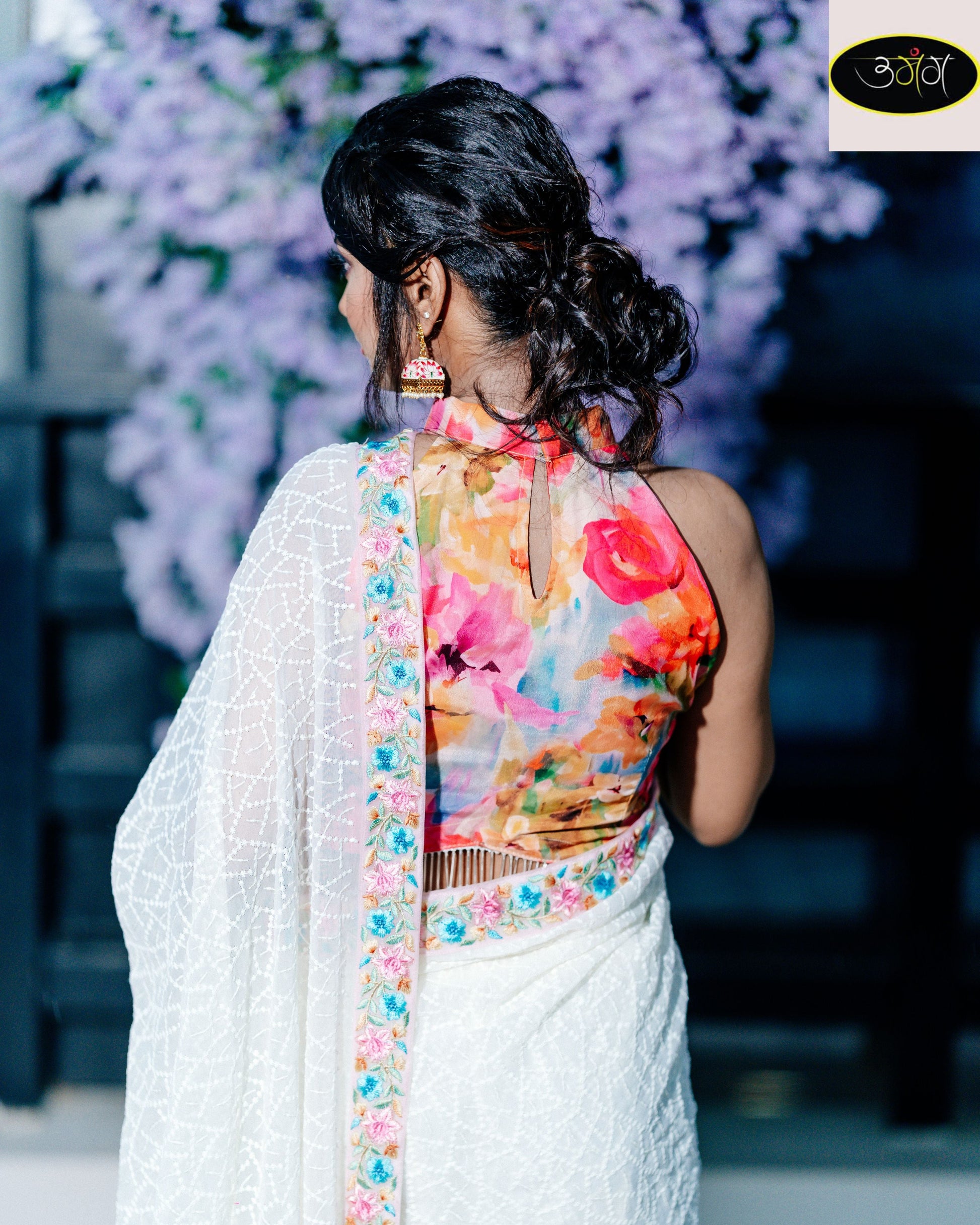Celebrate femininity with this effortlessly stylish white stitched georgette saree, paired with a vibrant halter-neck floral blouse.
