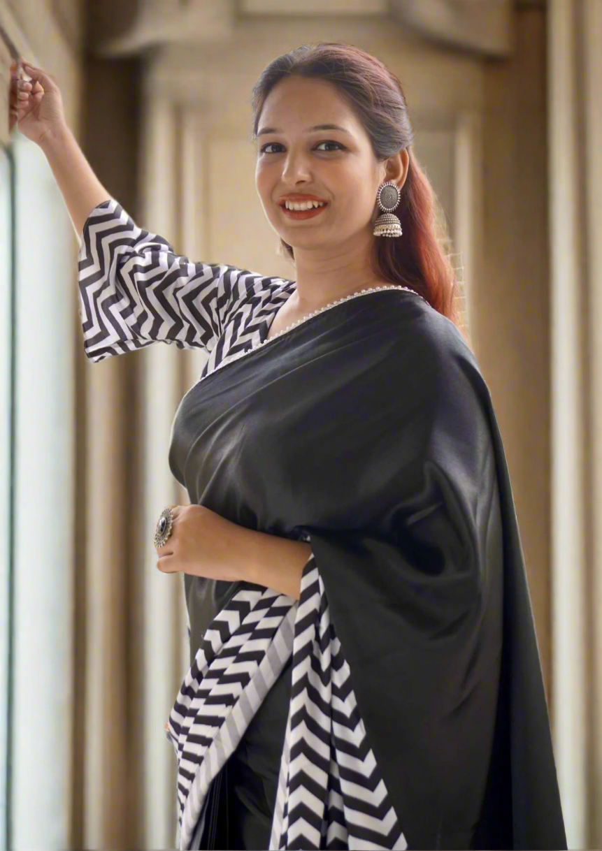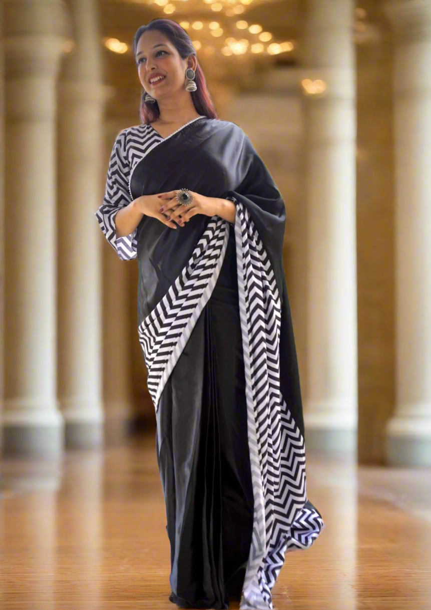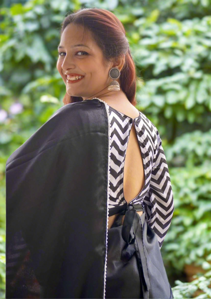 Meet the saree that redefines timeless elegance with a splash of attitude. This black saree features a striking black-and-white striped border that frames your look with modern flair. The matching blouse steals the show with a daring backless design, finished off with a chic bow that lets you wear it to your Work Wear, Casual Wear and Dinner Parties- all collections.