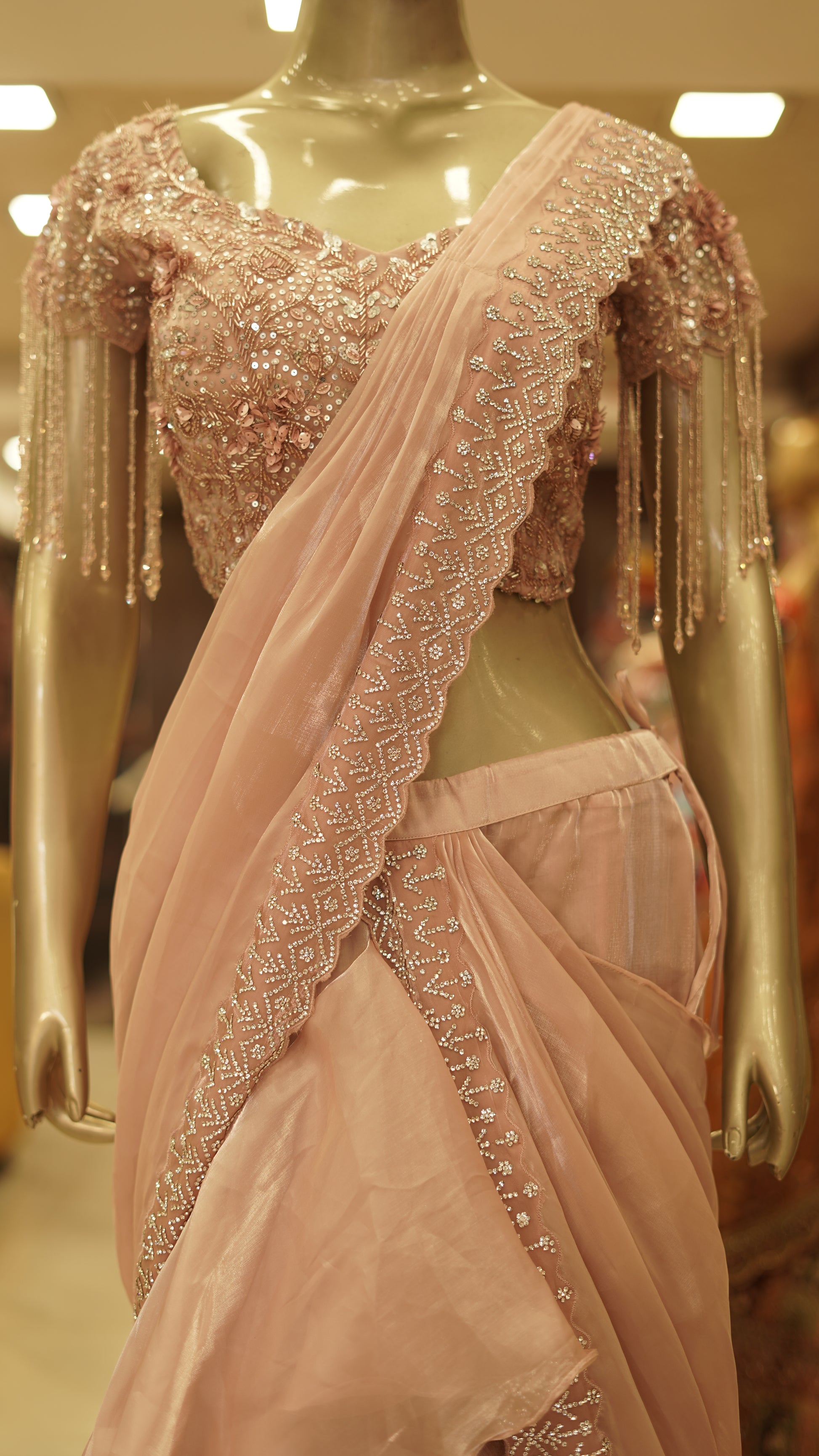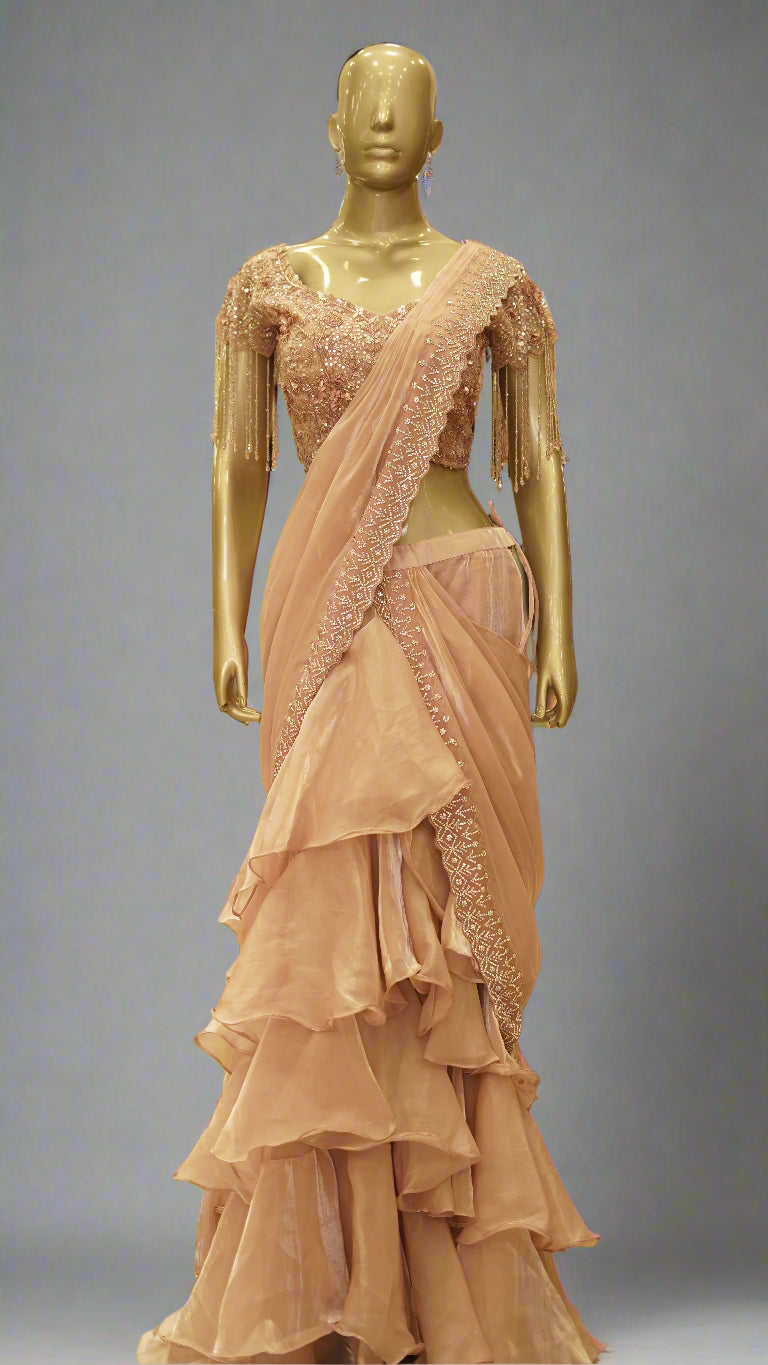 For days when you want luxury without the layers — this ready-to-wear saree features a Jimmy Choo-inspired frilled skirt with a flowing palla that moves with grace. Paired with a hand-embroidered blouse that's heavy on elegance and rich in detail, it's designed to make an impression without weighing you down. The blouse sleeves are finished with delicate tassels that swing with every step.