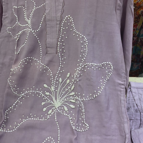 This elegant pearl-embellished suit in lilac is crafted from a silky blend fabric that offers both softness and breathability. Its refined pearl work adds a sophisticated touch, making it ideal for outings and special occasions. The lightweight, easy-to-style material ensures comfort throughout the day while maintaining a polished look. Perfect for those seeking a blend of grace and practicality in their wardrobe.