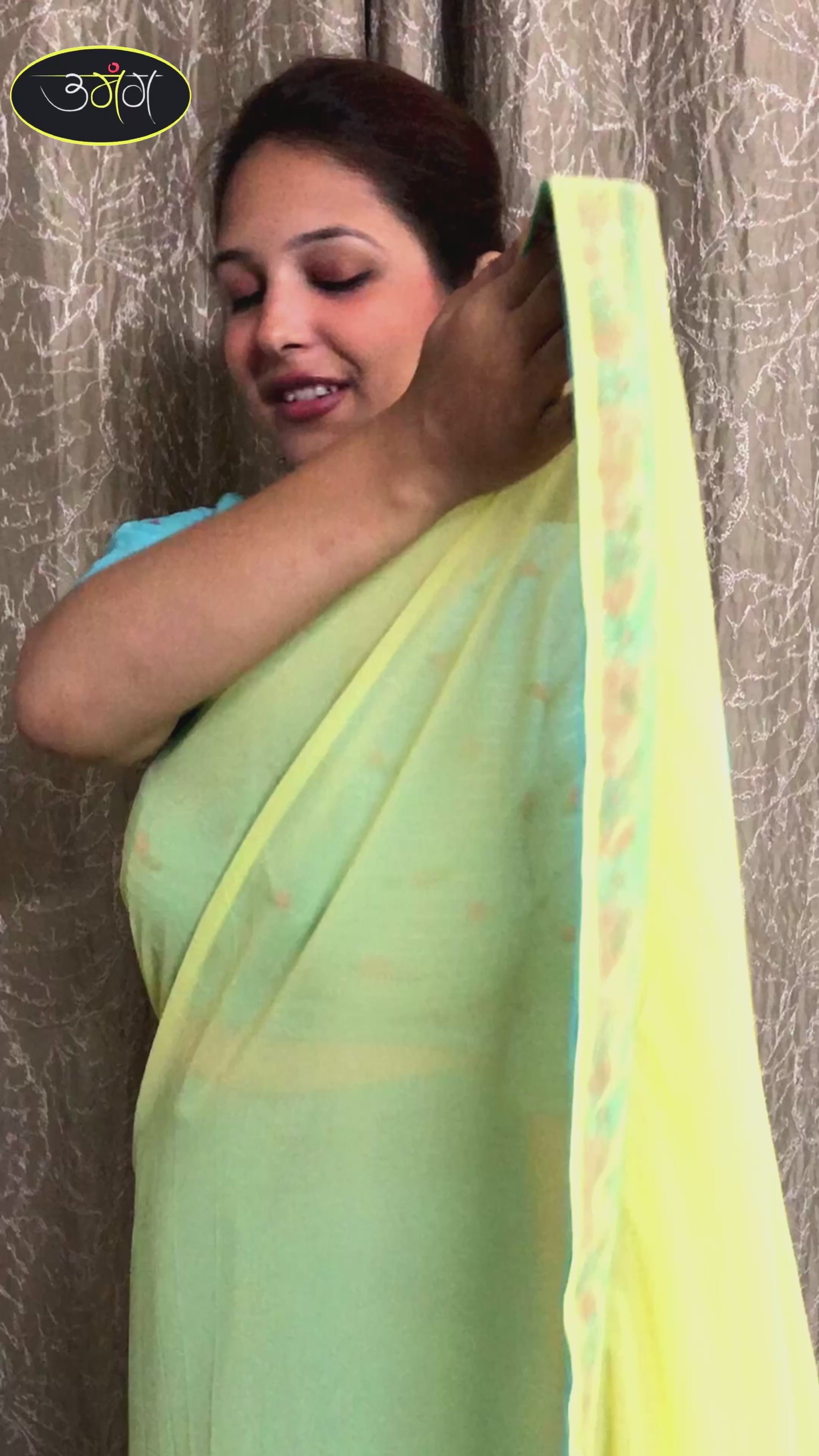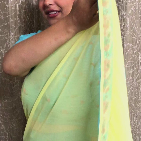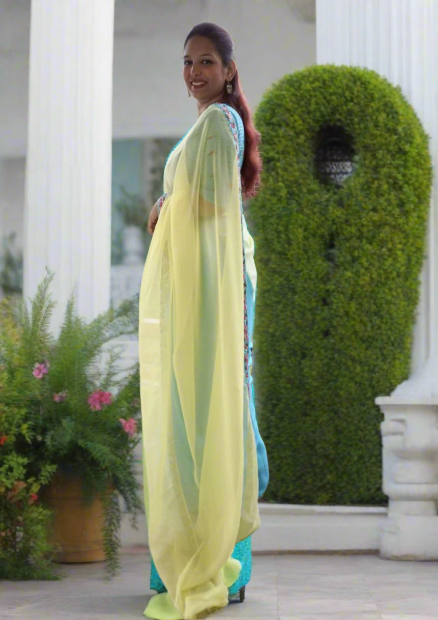 Lemon yellow pallu making it ideal for day occasions like Haldi, Mehendi and Welcome Lunch!