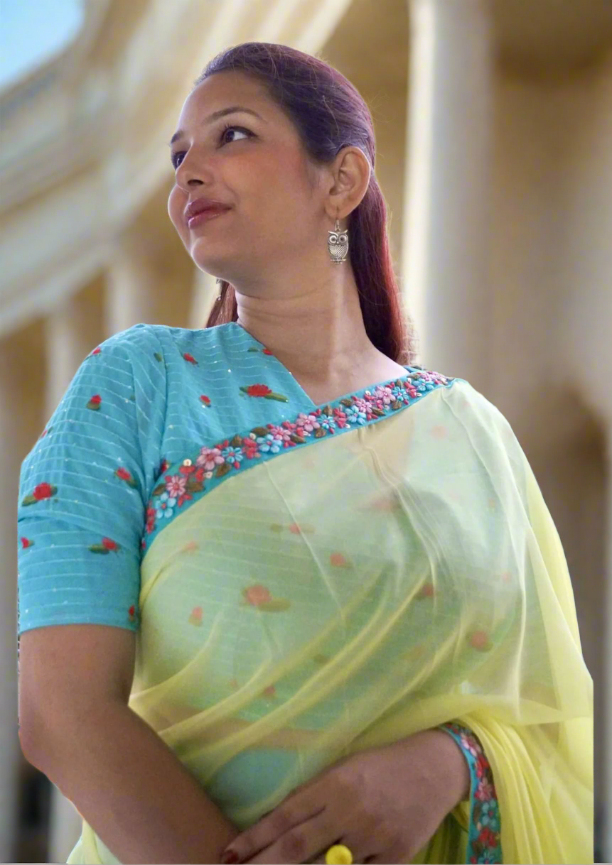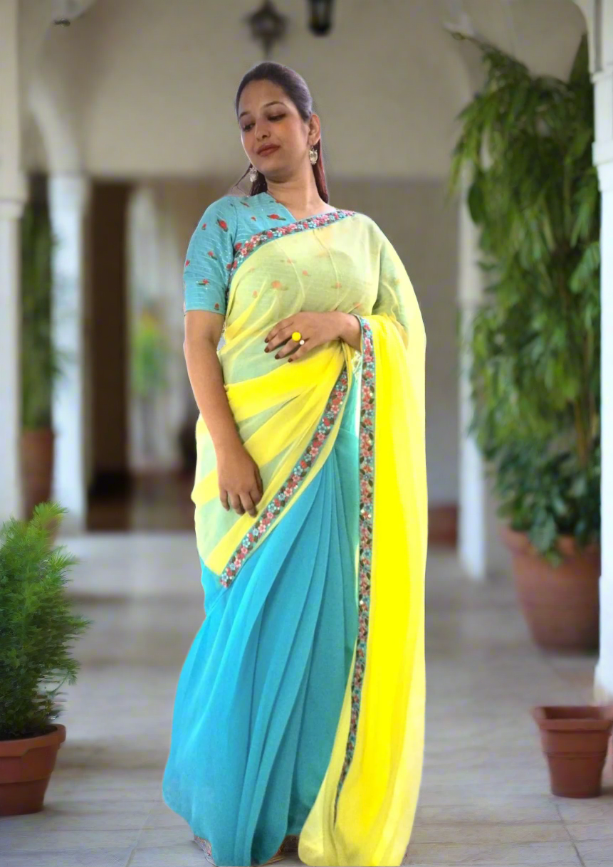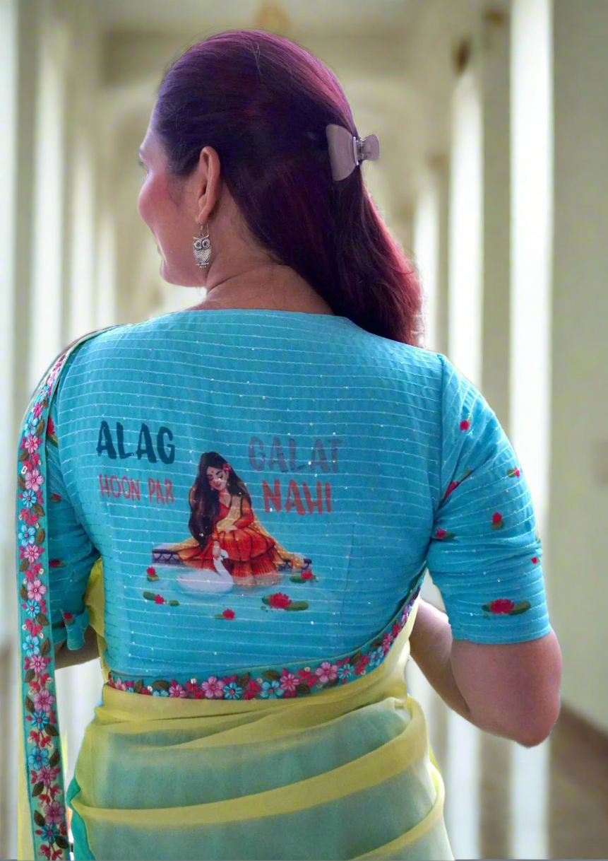 Not your average saree — this ready-to-wear beauty screams personality. The electric blue blouse boldly flaunts the cheeky phrase “Alag Hu Par Galar Nahi” on the back, while the yellow pallu and floral border mix tradition with a splash of rebellious fun. Perfect for women who aren’t afraid to stand out and speak their mind.