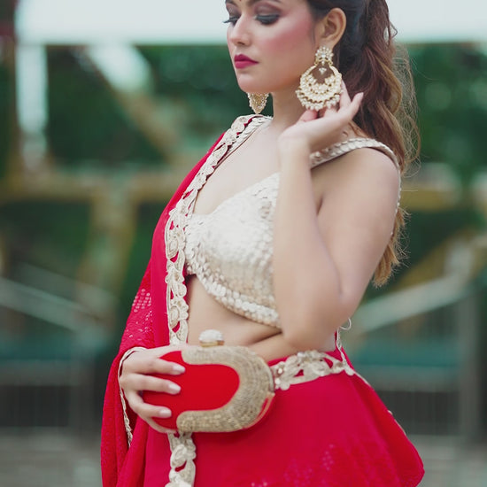 Make an unforgettable entrance in this stunning georgette saree featuring intricate jaal self-work and a rich hand-embroidered gold border. The bold gold blouse perfectly compliments the saree, creating a luxurious ensemble that radiates red carpet glamour. Pre-stitched for easy draping, this saree is your go-to for weddings, gala nights, and high-profile celebrations.