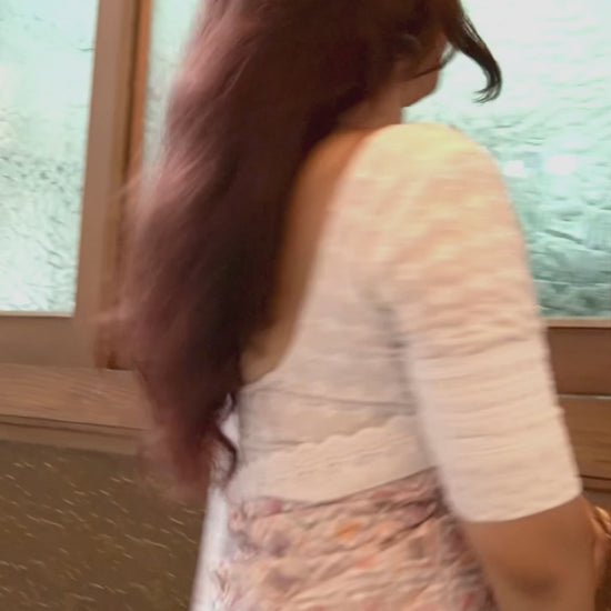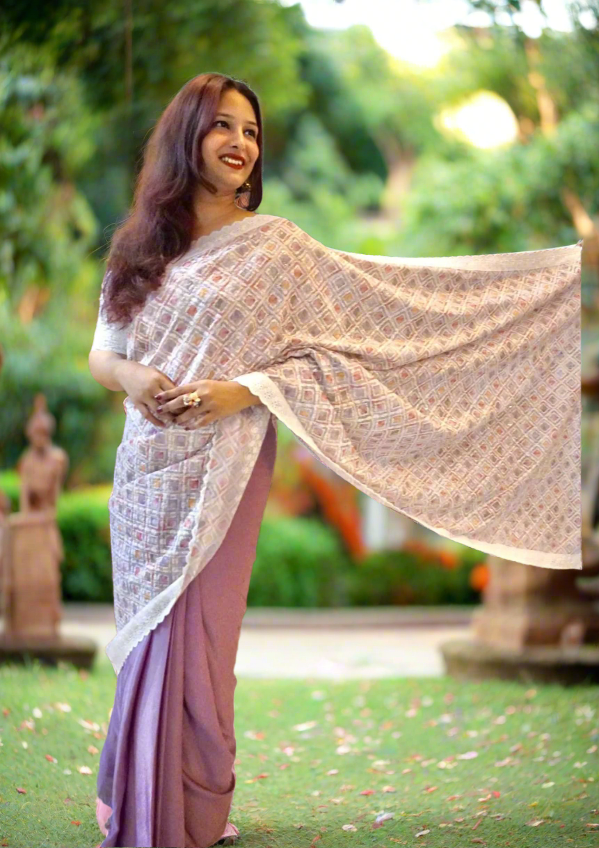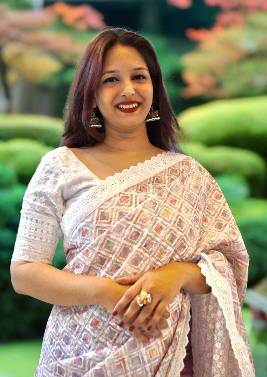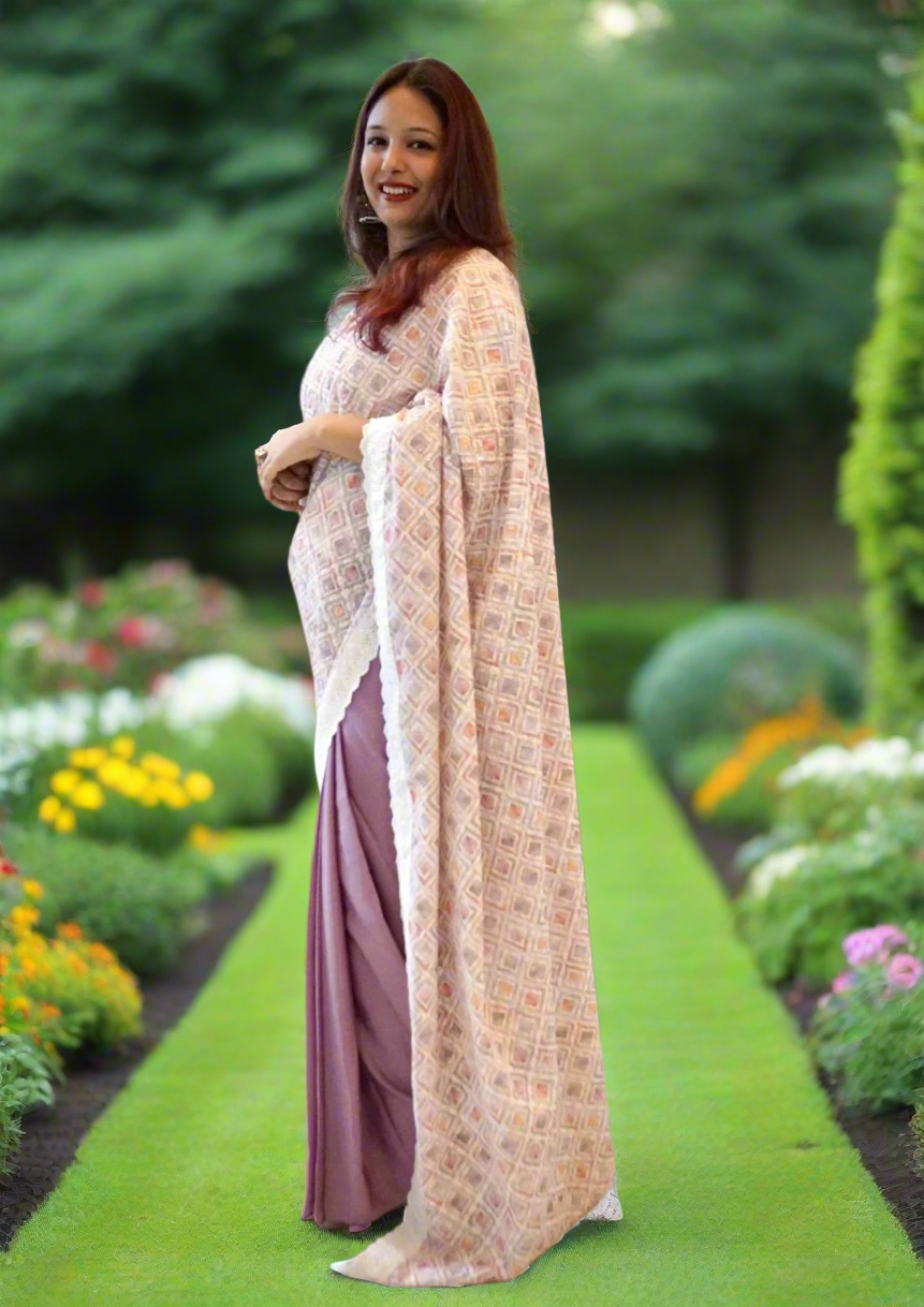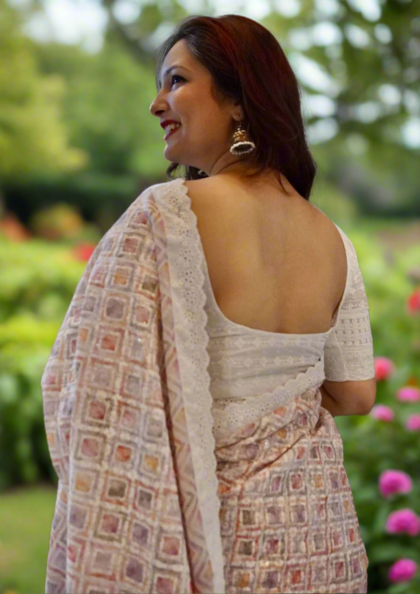his cotton saree is a fresh take on everyday elegance, featuring a delicate pastel multicolour square digital print that adds subtle vibrancy. A light touch of shimmer comes from transparent sequins artfully scattered across the fabric, catching the light beautifully without overpowering the look. The saree is framed by a crisp white cutwork border, adding a handcrafted charm and refined finish. Mauve pleats bring a soft contrast, rounding off this ready-to-wear saree that’s both breathable and stylish—perfect for daytime events or casual celebrations, even work.